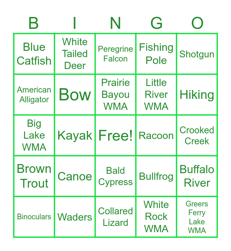 This bingo card has a free space and 49 words: Bobcat, Greers Ferry Lake WMA, Barred Owl, Collared Lizard, Canoe, Largemouth Bass, White Tailed Deer, Great Blue Heron, American Alligator, Crowley's Ridge, Bow, Fishing Pole, Buffalo River, Bullfrog, Alligator Gar, White Oak, Prairie Bayou WMA, Racoon, Longear Sunfish, Shotgun, Kayak, White Rock WMA, Blue Catfish, Little River WMA, Camping, Hiking, Binoculars, White Crappie, Bald Cypress, Brown Trout, Arkansas River, Ozark Moutain, Smallmouth Bass, Boots, Waders, Red-Tailed Hawk, Black Bear, Elk, Crooked Creek, Caddo River, Dip Net, Ozark Hellbender, Alligator Snapping Turtle, Cedar Mountain WMA, Big Lake WMA, Peregrine Falcon, Paddle Fish, Eastern Redbud and Electrofishing.