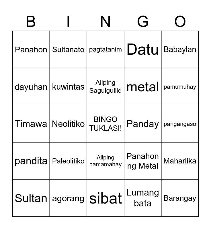 This bingo card has a free space and 24 words: Sultan, Paleolitiko, Aliping Saguiguilid, Lumang bata, Babaylan, Panahon, Sultanato, pagtatanim, Panday, pangangaso, Timawa, kuwintas, Panahon ng Metal, Maharlika, dayuhan, agorang, sibat, Datu, pamumuhay, pandita, Neolitiko, Aliping namamahay, metal and Barangay.