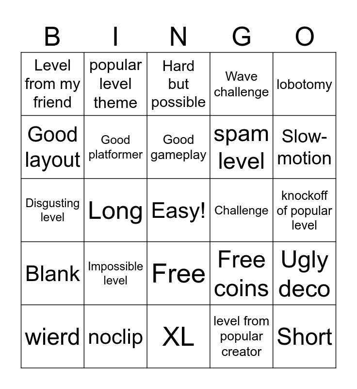 This bingo card has a free space and 24 words: Impossible level, noclip, Good gameplay, wierd, lobotomy, Level from my friend, Good layout, popular level theme, Challenge, Free, spam level, Disgusting level, Free coins, Ugly deco, Good platformer, level from popular creator, knockoff of popular level, Hard but possible, Slow-motion, Long, Short, Blank, Wave challenge and XL.