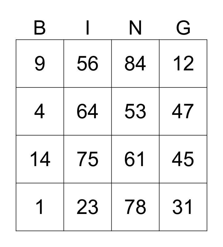 This bingo card has 16 words: 1, 23, 84, 12, 4, 56, 61, 45, 9, 64, 78, 47, 14, 75, 53 and 31.