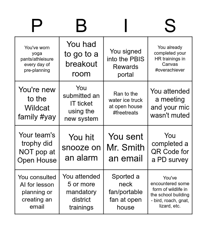 This bingo card has 16 words: You attended 5 or more mandatory district trainings, You completed a QR Code for a PD survey, You signed into the PBIS Rewards portal, You've worn yoga pants/athleisure every day of pre-planning, Your team's trophy did NOT pop at Open House, You had to go to a breakout room, You sent Mr. Smith an email, Sported a neck fan/portable fan at open house, You're new to the Wildcat family #yay, You submitted an IT ticket using the new system, You consulted AI for lesson planning or creating an email, You already completed your HR trainings in Canvas #overachiever, You hit snooze on an alarm, You attended a meeting and your mic wasn't muted, Ran to the water ice truck at open house #freetreats and You've encountered some form of wildlife in the school building - bird, roach, gnat, lizard, etc..