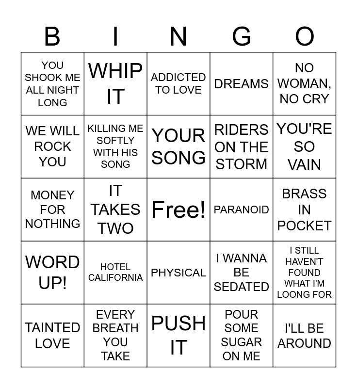 This bingo card has a free space and 24 words: HOTEL CALIFORNIA, EVERY BREATH YOU TAKE, YOUR SONG, TAINTED LOVE, NO WOMAN, NO CRY, YOU SHOOK ME ALL NIGHT LONG, WE WILL ROCK YOU, WHIP IT, PARANOID, PHYSICAL, RIDERS ON THE STORM, MONEY FOR NOTHING, I WANNA BE SEDATED, I STILL HAVEN'T FOUND WHAT I'M LOONG FOR, KILLING ME SOFTLY WITH HIS SONG, POUR SOME SUGAR ON ME, BRASS IN POCKET, ADDICTED TO LOVE, YOU'RE SO VAIN, IT TAKES TWO, I'LL BE AROUND, WORD UP!, DREAMS and PUSH IT.