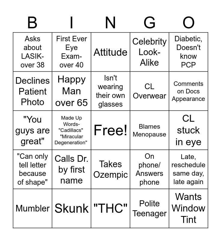 This bingo card has a free space and 24 words: Calls Dr. by first name, Skunk, Isn't wearing their own glasses, Mumbler, Diabetic, Doesn't know PCP, Asks about LASIK- over 38, Declines Patient Photo, First Ever Eye Exam-over 40, Blames Menopause, Takes Ozempic, CL Overwear, "You guys are great", On phone/ Answers phone, Late, reschedule same day, late again, Happy Man over 65, Polite Teenager, CL stuck in eye, Attitude, Comments on Docs Appearance, Made Up Words- "Cadillacs" "Miracular Degeneration", Wants Window Tint, "Can only tell letter because of shape", Celebrity Look-Alike and "THC".