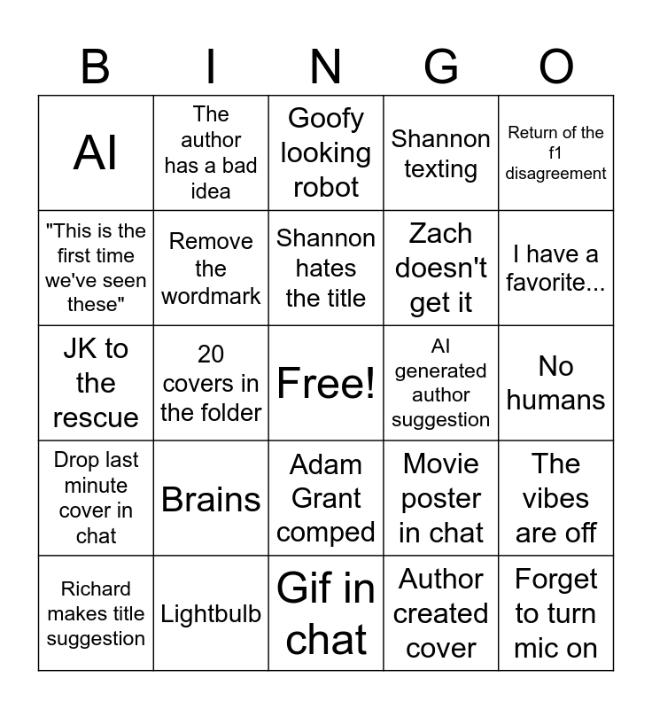 This bingo card has a free space and 24 words: Brains, Lightbulb, Shannon hates the title, Richard makes title suggestion, Return of the f1 disagreement, AI, "This is the first time we've seen these", The author has a bad idea, AI generated author suggestion, Adam Grant comped, Zach doesn't get it, JK to the rescue, Movie poster in chat, The vibes are off, Remove the wordmark, Author created cover, No humans, Goofy looking robot, I have a favorite..., 20 covers in the folder, Forget to turn mic on, Drop last minute cover in chat, Shannon texting and Gif in chat.