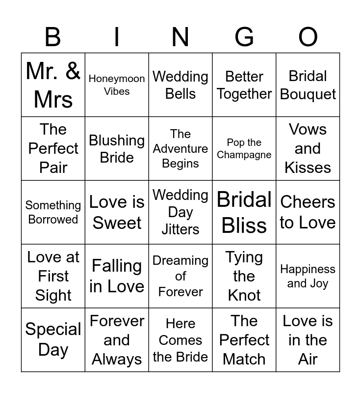 This bingo card has 31 words: Here Comes the Bride, To Have and to Hold, Love is Sweet, Happily Ever After, Mr. & Mrs, Wedding Bells, Blushing Bride, Tying the Knot, Bridal Bliss, The Perfect Match, Cheers to Love, Wedding Day Jitters, Love is in the Air, Bride-To-Be, Vows and Kisses, Cherishing the Moments, Happiness and Joy, Falling in Love, Love at First Sight, Dreaming of Forever, Bridal Bouquet, Saying "I Do", Special Day, Honeymoon Vibes, Pop the Champagne, The Perfect Pair, Better Together, Something Borrowed, Forever and Always, The Adventure Begins and Love Story.