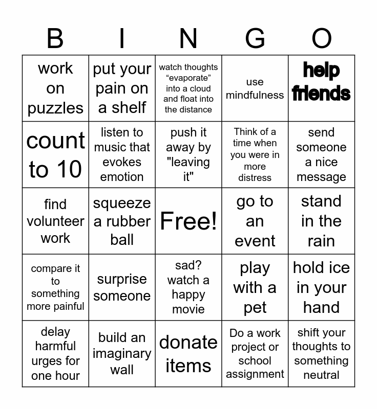 This bingo card has a free space and 41 words: rent a movie, find volunteer work, Put your situation in perspective, listen to music that evokes emotion, build an imaginary wall, sad? watch a happy movie, push it away by "leaving it", clean your room, help friends, compare it to something more painful, squeeze a rubber ball, use mindfulness, shift your thoughts to something neutral, stand in the rain, go to an event, surprise someone, remember how far you've come, work on puzzles, Write in a journal, watch thoughts “evaporate” into a cloud and float into the distance, hold ice in your hand, play a game, donate items, Think of a time when you were in more distress, yell "no", listen to loud music, Do a work project or school assignment, listen to a podcast, send someone a nice message, remember a time you were resilient, take a cold shower, put your pain on a shelf, delay harmful urges for one hour, read a book, play with a pet, count to 10, cook a meal, repeat reassuring affirmations, help a neighbor, go for a walk and write a letter to someone.