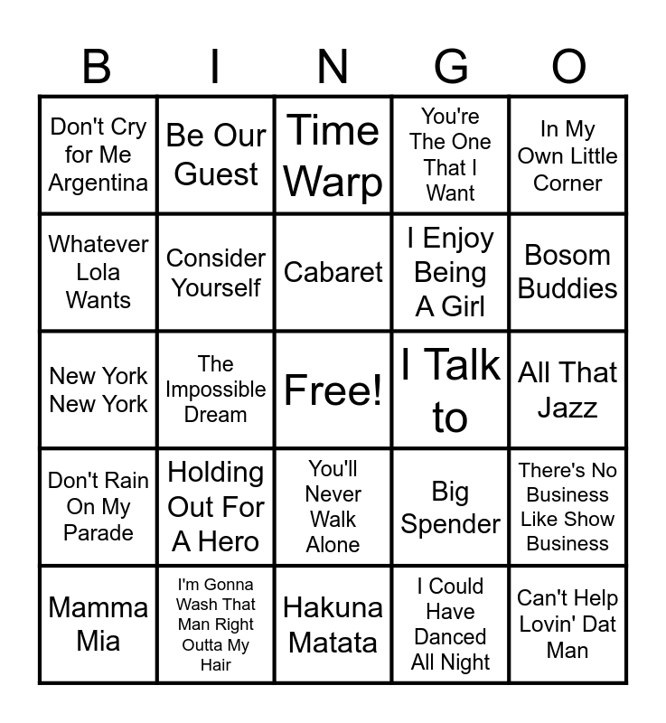 This bingo card has a free space and 64 words: Lullaby of Broadway, One, It's a Hard Knock Life, There's No Business Like Show Business, Anything Goes, On Broadway, Be Our Guest, Put on a Happy Face, Cabaret, If Ever I Would Leave You, You'll Never Walk Alone, Memory, All That Jazz, In My Own Little Corner, I Got Rhythm, Whatever Lola Wants, The Impossible Dream, Don't Cry for Me Argentina, Old Devil Moon, I Enjoy Being A Girl, Holding Out For A Hero, Don't Rain On My Parade, You're The One That I Want, Luck Be a Lady, Let Me Entertain You, Aquarius, Good Morning Baltimore, Hello, Dolly!, Can't Take My Eyes off of You, I Don't Know How To Love Him, Any Dream Will Do, I Hate Men, On My Own, Suddenly Seymour, Bosom Buddies, Mamma Mia, A Spoonful of Sugar, I Could Have Danced All Night, Oh, What A Beautiful Mornin', Consider Yourself, New York New York, I Talk to, I Could Write A Book, Corner of the Sky, Seasons of Love, Can't Help Lovin' Dat Man, I'm Gonna Wash That Man Right Outta My Hair, Johanna, Big Spender, Try To Remember, If I Were a Rich Man, Getting To Know You, Hakuna Matata, Till There Was You, King of New York, The Phantom of the Opera, Time Warp, My Favorite Things, Drink, Drink, Drink, Over the Rainbow, All The Things You Are, Gee, Officer Krupke, Sisters and 9 to 5.