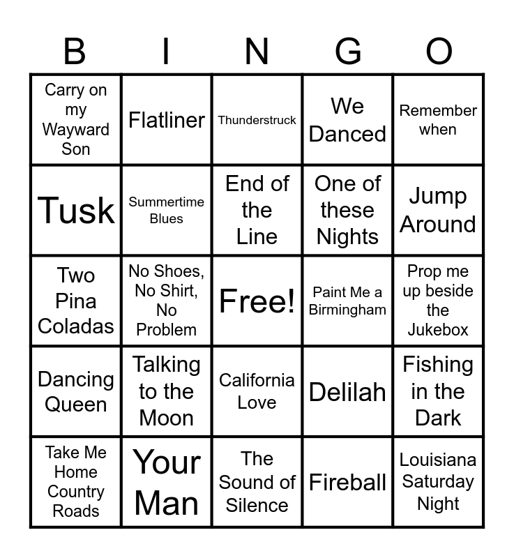 This bingo card has a free space and 44 words: Slide, Louisiana Saturday Night, Seminole Wind, Take Me Home Country Roads, Apple Jack, Fireball, Thunderstruck, Baby's got her Blue Jeans On, Remember when, Your Man, We Danced, Paint Me a Birmingham, California Love, Talking to the Moon, Excuse Me, The Sound of Silence, It's 5 o'clock Somewhere, Two Pina Coladas, Walking on Sunshine, Jump Around, Flatliner, Friends in Low Places, Achy Breaky Heart, Carry on my Wayward Son, Witchy Woman, Prop me up beside the Jukebox, Lovin' Touchin' Squeezin', I like it, I love it, Delilah, Dancing Queen, We will Rock You, Fishing in the Dark, Apache, Ventura Highway, No Shoes, No Shirt, No Problem, Babe, Night Fever, 4x4xU, End of the Line, Tusk, One of these Nights, Strawberry Wine, Summertime Blues and Hotel California.