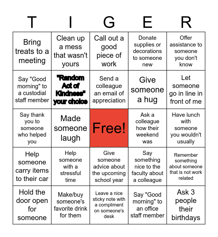 This bingo card has a free space and 24 words: Hold the door open for someone, Help someone with a stressful time, Send a colleague an email of appreciation, Say "Good morning" to an office staff member, Offer assistance to someone you don't know, Bring treats to a meeting, Clean up a mess that wasn't yours, Call out a good piece of work, Ask a colleague how their weekend was, Have lunch with someone you wouldn't usually, Say thank you to someone who helped you, "Random Act of Kindness" your choice, Say something nice to the faculty about a colleague, Remember something about someone that is not work related, Say "Good morning" to a custodial staff member, Make/buy someone's favorite drink for them, Leave a nice sticky note with a compliment on someone's desk, Donate supplies or decorations to someone new, Let someone go in line in front of me, Help someone carry items to their car, Made someone laugh, Give someone advice about the upcoming school year, Give someone a hug and Ask 3 people their birthdays.