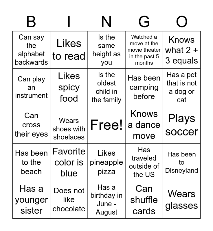 This bingo card has a free space and 24 words: Favorite color is blue, Does not like chocolate, Is the oldest child in the family, Has a younger sister, Knows what 2 + 3 equals, Can say the alphabet backwards, Can play an instrument, Likes to read, Knows a dance move, Likes pineapple pizza, Has been camping before, Can cross their eyes, Has traveled outside of the US, Has been to Disneyland, Likes spicy food, Can shuffle cards, Plays soccer, Is the same height as you, Has a pet that is not a dog or cat, Wears shoes with shoelaces, Wears glasses, Has been to the beach, Watched a move at the movie theater in the past 5 months and Has a birthday in June -August.