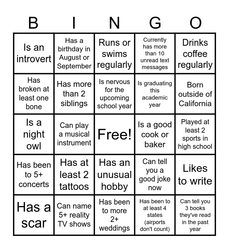 This bingo card has a free space and 24 words: Has at least 2 tattoos, Can name 5+ reality TV shows, Is nervous for the upcoming school year, Has a scar, Drinks coffee regularly, Is an introvert, Has broken at least one bone, Has a birthday in August or September, Is a good cook or baker, Has an unusual hobby, Is graduating this academic year, Is a night owl, Can tell you a good joke now, Likes to write, Has more than 2 siblings, Has been to at least 4 states (airports don't count), Played at least 2 sports in high school, Runs or swims regularly, Born outside of California, Can play a musical instrument, Can tell you 3 books they've read in the past year, Has been to 5+ concerts, Currently has more than 10 unread text messages and Has been to more 2+ weddings.