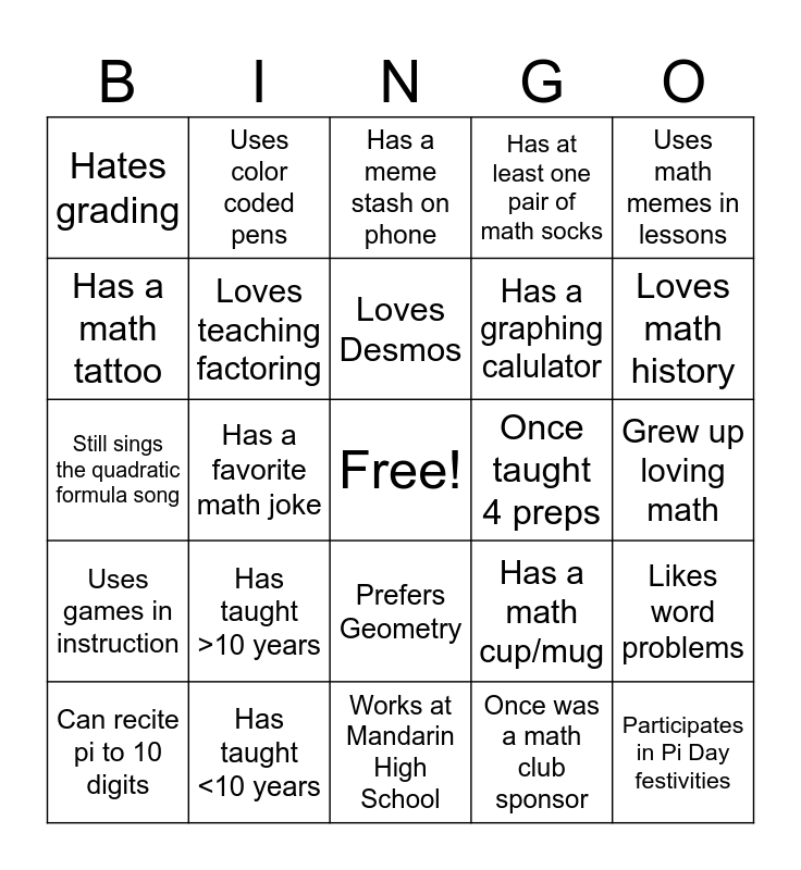 This bingo card has a free space and 24 words: Has taught >10 years, Has taught <10 years, Loves Desmos, Can recite pi to 10 digits, Uses math memes in lessons, Hates grading, Has a math tattoo, Uses color coded pens, Once taught 4 preps, Prefers Geometry, Has a graphing calulator, Still sings the quadratic formula song, Has a math cup/mug, Likes word problems, Loves teaching factoring, Once was a math club sponsor, Grew up loving math, Has a meme stash on phone, Loves math history, Has a favorite math joke, Participates in Pi Day festivities, Uses games in instruction, Has at least one pair of math socks and Works at Mandarin High School.