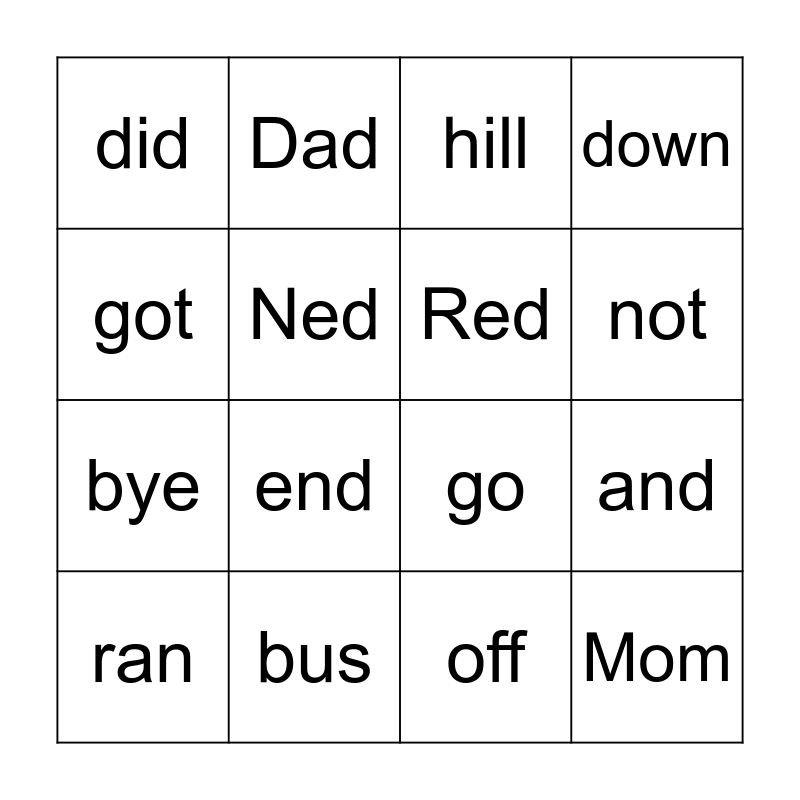 This bingo card has 22 words: bus, at, Dad, met, Ned, Red, did, hill, go, Mom, bye, down, up, stop, off, on, and, ran, end, got, not and the.
