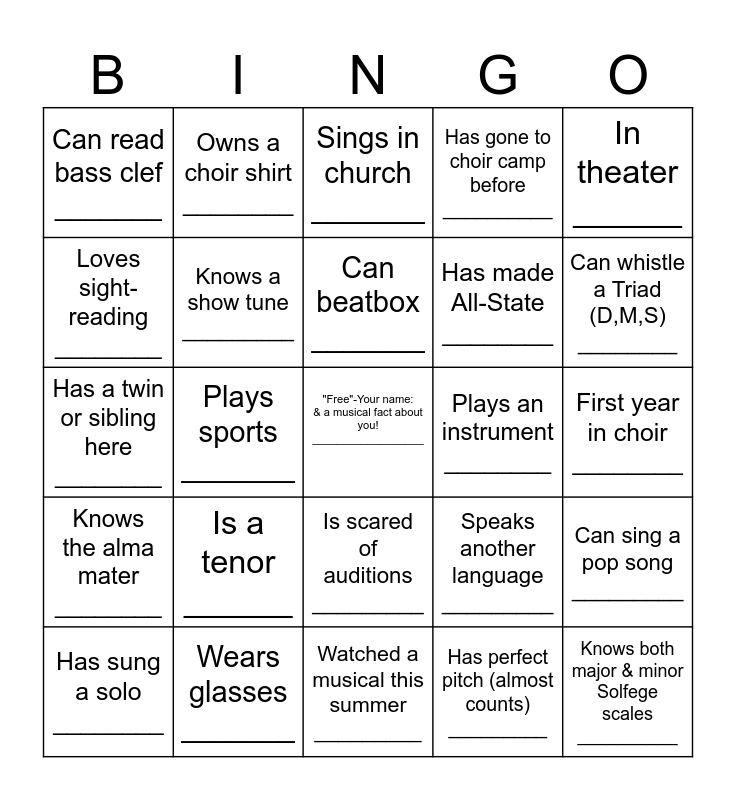 This bingo card has a free space and 24 words: Has sung a solo ________, Is a tenor ______, Can beatbox _______, Has perfect pitch (almost counts) _________, In theater ______, Can read bass clef _______, Owns a choir shirt ________, Sings in church _______, Plays an instrument ________, First year in choir ________, Has a twin or sibling here ________, Knows a show tune _________, Speaks another language _________, Can sing a pop song _________, Loves sight-reading ________, Wears glasses _______, Watched a musical this summer _________, Has gone to choir camp before __________, Can whistle a Triad (D,M,S) ________, Knows the alma mater ________, Plays sports _______, Is scared of auditions _________, Has made All-State ________ and Knows both major & minor Solfege scales __________.