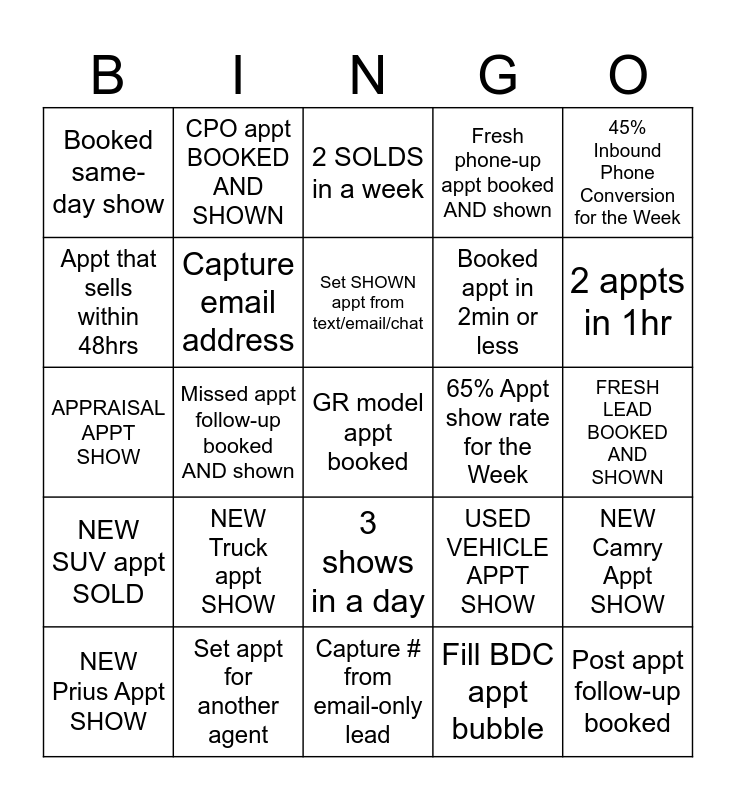This bingo card has 25 words: NEW Truck appt SHOW, Capture # from email-only lead, Set SHOWN appt from text/email/chat, NEW Prius Appt SHOW, 45% Inbound Phone Conversion for the Week, Booked same-day show, Appt that sells within 48hrs, CPO appt BOOKED AND SHOWN, 65% Appt show rate for the Week, 3 shows in a day, Booked appt in 2min or less, APPRAISAL APPT SHOW, USED VEHICLE APPT SHOW, NEW Camry Appt SHOW, Capture email address, Post appt follow-up booked, FRESH LEAD BOOKED AND SHOWN, 2 SOLDS in a week, 2 appts in 1hr, Missed appt follow-up booked AND shown, GR model appt booked, Set appt for another agent, NEW SUV appt SOLD, Fresh phone-up appt booked AND shown and Fill BDC appt bubble.