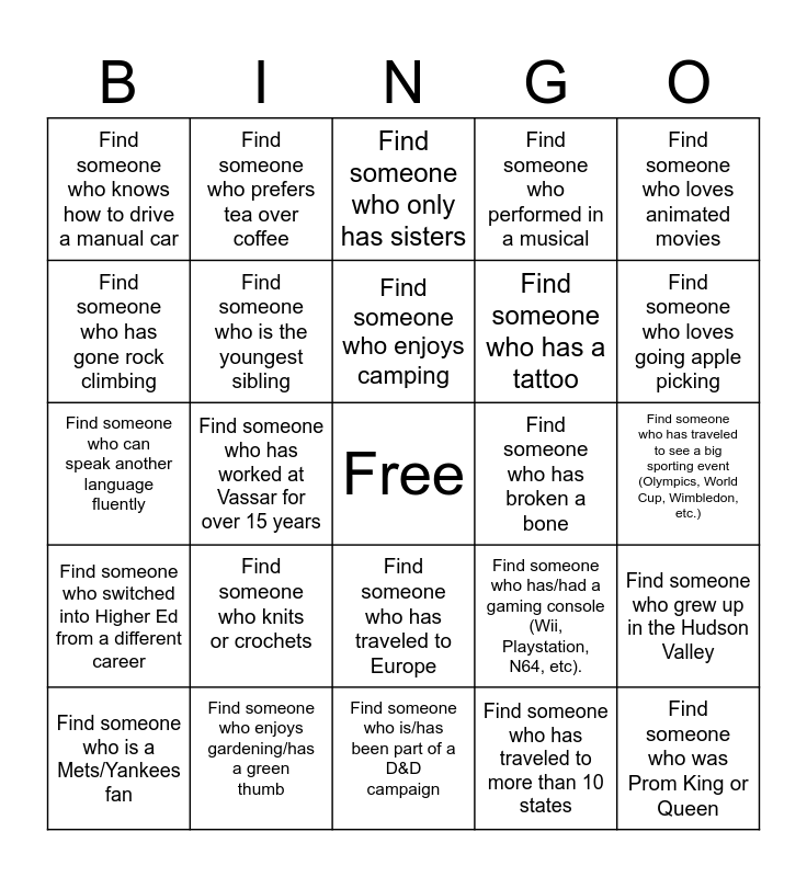 This bingo card has a free space and 24 words: Find someone who knits or crochets, Find someone who enjoys gardening/has a green thumb, Find someone who enjoys camping, Find someone who is a Mets/Yankees fan, Find someone who loves animated movies, Find someone who knows how to drive a manual car, Find someone who has gone rock climbing, Find someone who prefers tea over coffee, Find someone who has broken a bone, Find someone who has traveled to Europe, Find someone who has a tattoo, Find someone who can speak another language fluently, Find someone who has/had a gaming console (Wii, Playstation, N64, etc)., Find someone who grew up in the Hudson Valley, Find someone who is the youngest sibling, Find someone who has traveled to more than 10 states, Find someone who has traveled to see a big sporting event (Olympics, World Cup, Wimbledon, etc.), Find someone who only has sisters, Find someone who loves going apple picking, Find someone who has worked at Vassar for over 15 years, Find someone who was Prom King or Queen, Find someone who switched into Higher Ed from a different career, Find someone who performed in a musical and Find someone who is/has been part of a D&D campaign.