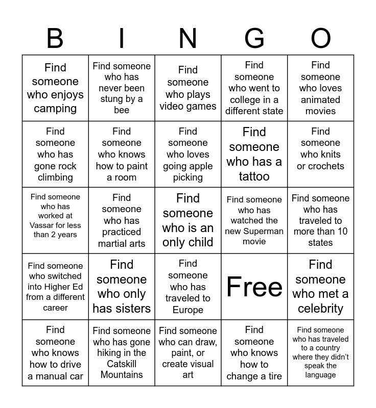 This bingo card has 25 words: Find someone who only has sisters, Find someone who can draw, paint, or create visual art, Find someone who loves going apple picking, Find someone who knows how to drive a manual car, Find someone who loves animated movies, Find someone who enjoys camping, Find someone who has gone rock climbing, Find someone who has never been stung by a bee, Find someone who has watched the new Superman movie, Find someone who has traveled to Europe, Find someone who has a tattoo, Find someone who has worked at Vassar for less than 2 years, Free, Find someone who met a celebrity, Find someone who knows how to paint a room, Find someone who has traveled to a country where they didn’t speak the language, Find someone who has traveled to more than 10 states, Find someone who plays video games, Find someone who knits or crochets, Find someone who has practiced martial arts, Find someone who is an only child, Find someone who has gone hiking in the Catskill Mountains, Find someone who switched into Higher Ed from a different career, Find someone who went to college in a different state and Find someone who knows how to change a tire.