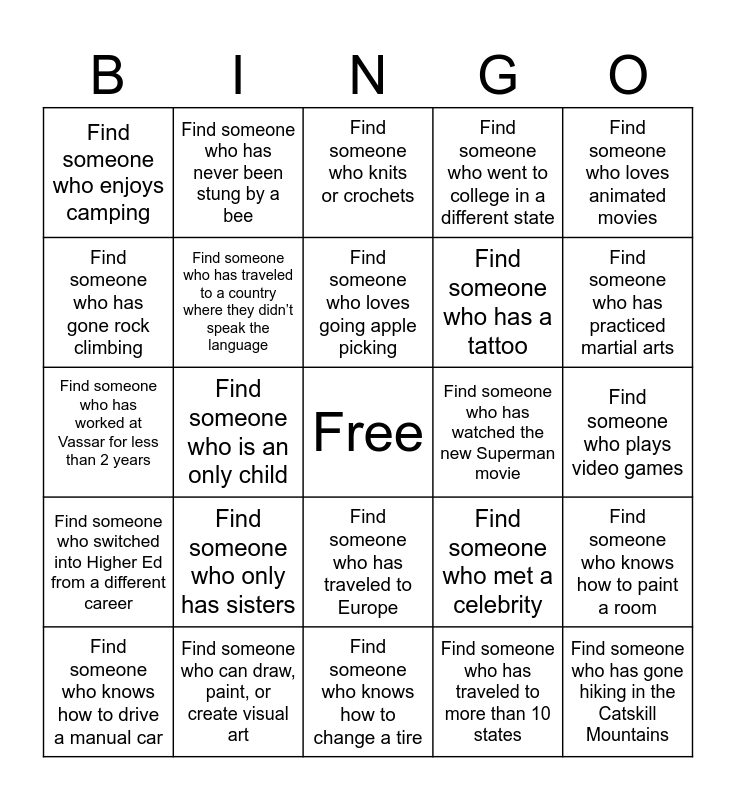 This bingo card has a free space and 24 words: Find someone who only has sisters, Find someone who can draw, paint, or create visual art, Find someone who loves going apple picking, Find someone who knows how to drive a manual car, Find someone who loves animated movies, Find someone who enjoys camping, Find someone who has gone rock climbing, Find someone who has never been stung by a bee, Find someone who has watched the new Superman movie, Find someone who has traveled to Europe, Find someone who has a tattoo, Find someone who has worked at Vassar for less than 2 years, Find someone who met a celebrity, Find someone who knows how to paint a room, Find someone who has traveled to a country where they didn’t speak the language, Find someone who has traveled to more than 10 states, Find someone who plays video games, Find someone who knits or crochets, Find someone who has practiced martial arts, Find someone who is an only child, Find someone who has gone hiking in the Catskill Mountains, Find someone who switched into Higher Ed from a different career, Find someone who went to college in a different state and Find someone who knows how to change a tire.