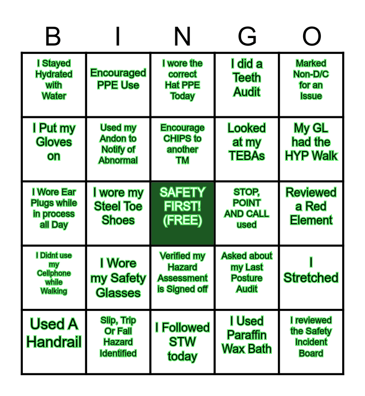This bingo card has a free space and 24 words: I Wore my Safety Glasses, Slip, Trip Or Fall Hazard Identified, Encourage CHIPS to another TM, Used A Handrail, Marked Non-D/C for an Issue, I Stayed Hydrated with Water, I Put my Gloves on, Encouraged PPE Use, STOP, POINT AND CALL used, Verified my Hazard Assessment is Signed off, Looked at my TEBAs, I Wore Ear Plugs while in process all Day, Asked about my Last Posture Audit, I Stretched, Used my Andon to Notify of Abnormal, I Used Paraffin Wax Bath, Reviewed a Red Element, I wore the correct Hat PPE Today, My GL had the HYP Walk, I wore my Steel Toe Shoes, I reviewed the Safety Incident Board, I Didnt use my Cellphone while Walking, I did a Teeth Audit and I Followed STW today.