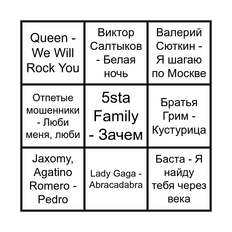 This bingo card has 27 words: Андрей Губин - Ночь, Антон Токарев - Седьмой лепесток, Баста - Я найду тебя через века, Браво - Любите, девушки, Братья Грим - Кустурица, Валерий Сюткин - Я шагаю по Москве, Виктор Салтыков - Белая ночь, Дискотека Авария - Малинки, Земфира - ХОЧЕШЬ, Король и Шут - Лесник, Леонид Агутин - Остров, Отпетые мошенники - Люби меня, люби, Секрет - Моя любовь на пятом этаже, Синий трактор - Едет трактор, Филипп Киркоров - Я эту жизнь тебе отдам, Chris Montez - Sunny, Jaxomy, Agatino Romero - Pedro, Lady Gaga - Abracadabra, Los Del Rio - Macarena, Queen - We Will Rock You, Ricchi E Poveri - Sarà perchè ti amo, Shakira - Waka Waka, Teach-In - Ding-A-Dong, The Hatters - Russian Style, Uma2rman - Папины дочки, 5sta Family - Зачем and Валерий Меладзе - Иностранец.
