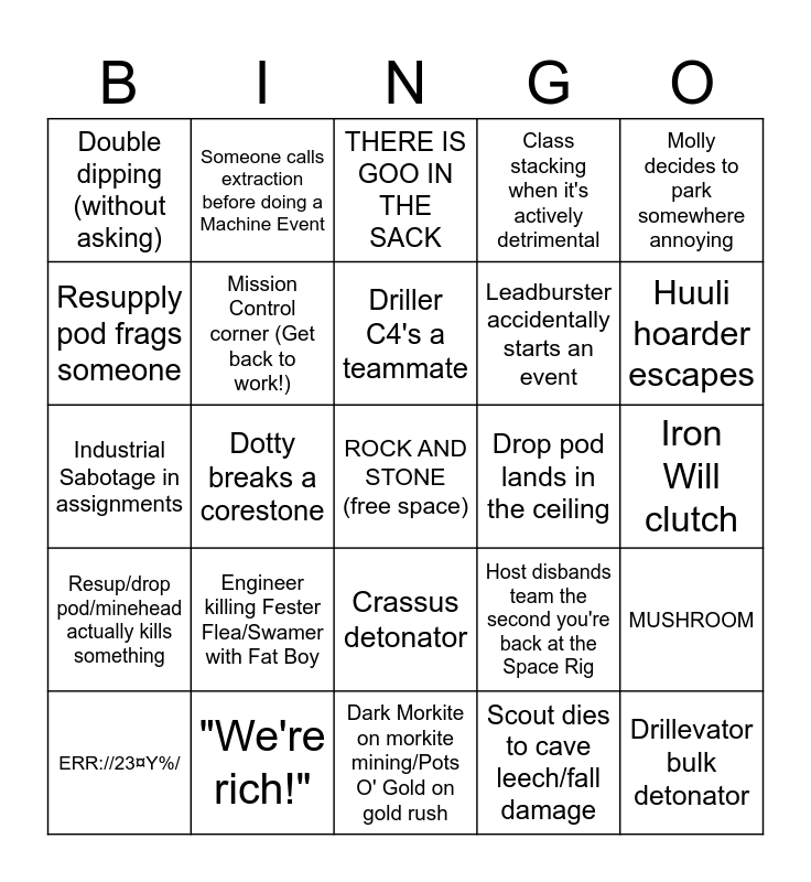 This bingo card has a free space and 24 words: Engineer killing Fester Flea/Swamer with Fat Boy, "We're rich!", Driller C4's a teammate, ERR://23¤Y%/, Molly decides to park somewhere annoying, Double dipping (without asking), Resupply pod frags someone, Someone calls extraction before doing a Machine Event, Drop pod lands in the ceiling, Crassus detonator, Leadburster accidentally starts an event, Industrial Sabotage in assignments, Host disbands team the second you're back at the Space Rig, MUSHROOM, Mission Control corner (Get back to work!), Scout dies to cave leech/fall damage, Iron Will clutch, THERE IS GOO IN THE SACK, Huuli hoarder escapes, Dotty breaks a corestone, Drillevator bulk detonator, Resup/drop pod/minehead actually kills something, Class stacking when it's actively detrimental and Dark Morkite on morkite mining/Pots O' Gold on gold rush.