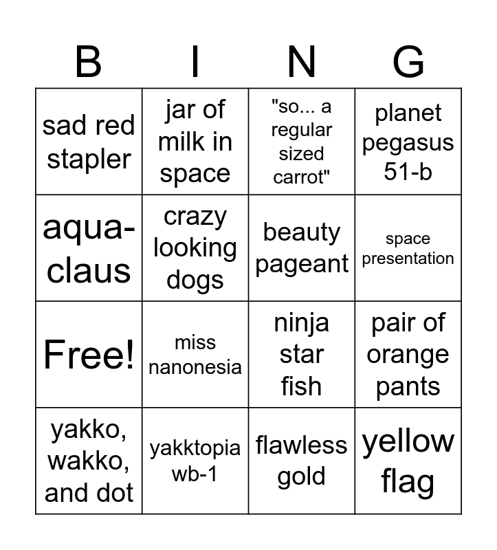 This bingo card has 20 words: pair of orange pants, pizza, "so... a regular sized carrot", blue and red rocket, yakko, wakko, and dot, aqua-claus, yakktopia wb-1, sad red stapler, Free!, jar of milk in space, miss nanonesia, ninja star fish, crazy looking dogs, yellow flag, beauty pageant, miss spain's contact lenses, space presentation, planet pegasus 51-b, flawless gold and alien waiter.