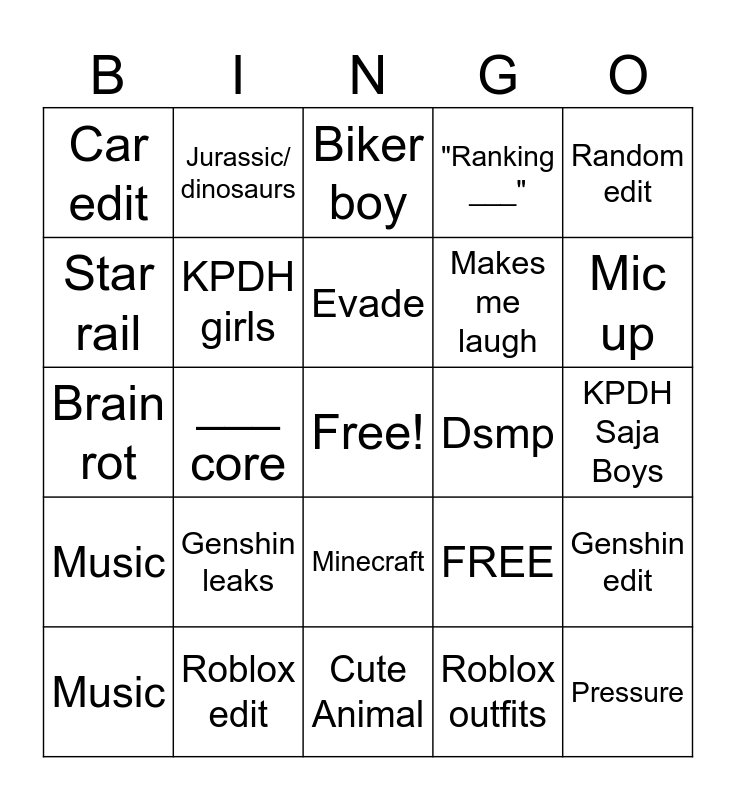 This bingo card has a free space and 25 words: Genshin leaks, Cute Animal, Evade, Music, Random edit, Car edit, Star rail, Jurassic/ dinosaurs, Dsmp, Minecraft, Makes me laugh, Brain rot, FREE, Genshin edit, KPDH girls, For Eva, KPDH Saja Boys, Biker boy, Mic up, ___ core, Pressure, Roblox edit, Music, "Ranking ___" and Roblox outfits.