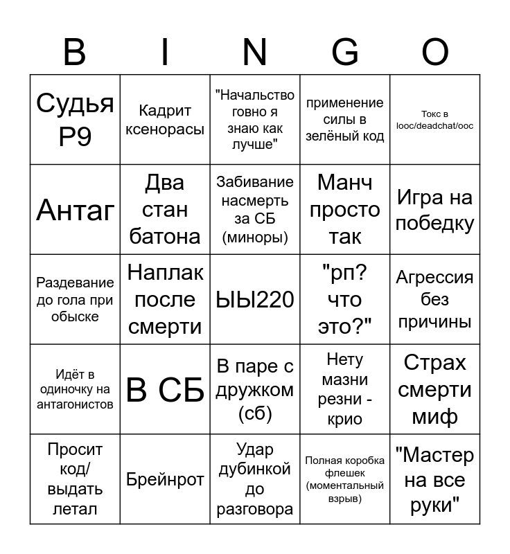 This bingo card has a free space and 24 words: В СБ, Брейнрот, Забивание насмерть за СБ (миноры), Просит код/выдать летал, Токс в looc/deadchat/ooc, Судья Р9, Антаг, Кадрит ксенорасы, "рп? что это?", В паре с дружком (сб), Манч просто так, Раздевание до гола при обыске, Нету мазни резни - крио, Страх смерти миф, Два стан батона, Полная коробка флешек (моментальный взрыв), Агрессия без причины, "Начальство говно я знаю как лучше", Игра на победку, Наплак после смерти, "Мастер на все руки", Идёт в одиночку на антагонистов, применение силы в зелёный код and Удар дубинкой до разговора.