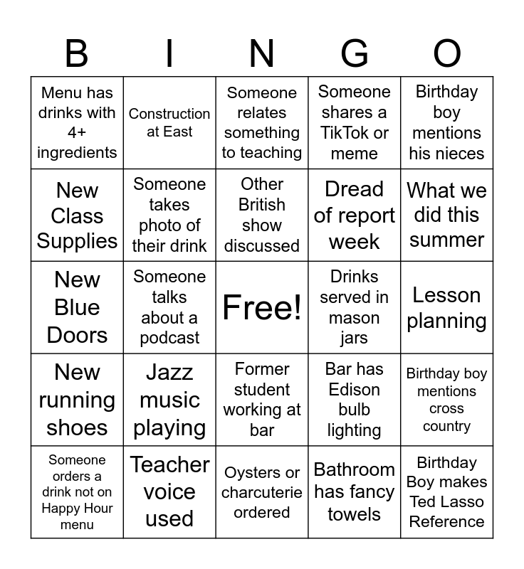 This bingo card has a free space and 29 words: Someone orders a drink not on Happy Hour menu, Birthday Boy mentions a Taskmaster Task, Someone talks about a podcast, Talk of staff not present, Menu has drinks with 4+ ingredients, Someone relates something to teaching, Someone takes photo of their drink, Jazz music playing, Drinks served in mason jars, Teacher voice used, Lesson planning, Birthday Boy makes Ted Lasso Reference, Oysters or charcuterie ordered, Bathroom has fancy towels, What we did this summer, Historical reference, Former student working at bar, New running shoes, Birthday boy mentions his nieces, New Blue Doors, Bar has Edison bulb lighting, Former student working at bar, Dread of report week, New Class Supplies, Someone shares a TikTok or meme, Construction at East, Birthday boy mentions cross country, Other British show discussed and Class sizes.