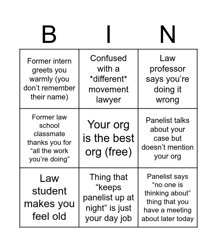 This bingo card has a free space and 8 words: Panelist talks about your case but doesn’t mention your org, Law professor says you’re doing it wrong, Confused with a *different* movement lawyer, Law student makes you feel old, Former intern greets you warmly (you don’t remember their name), Panelist says “no one is thinking about” thing that you have a meeting about later today, Former law school classmate thanks you for “all the work you’re doing” and Thing that “keeps panelist up at night” is just your day job.