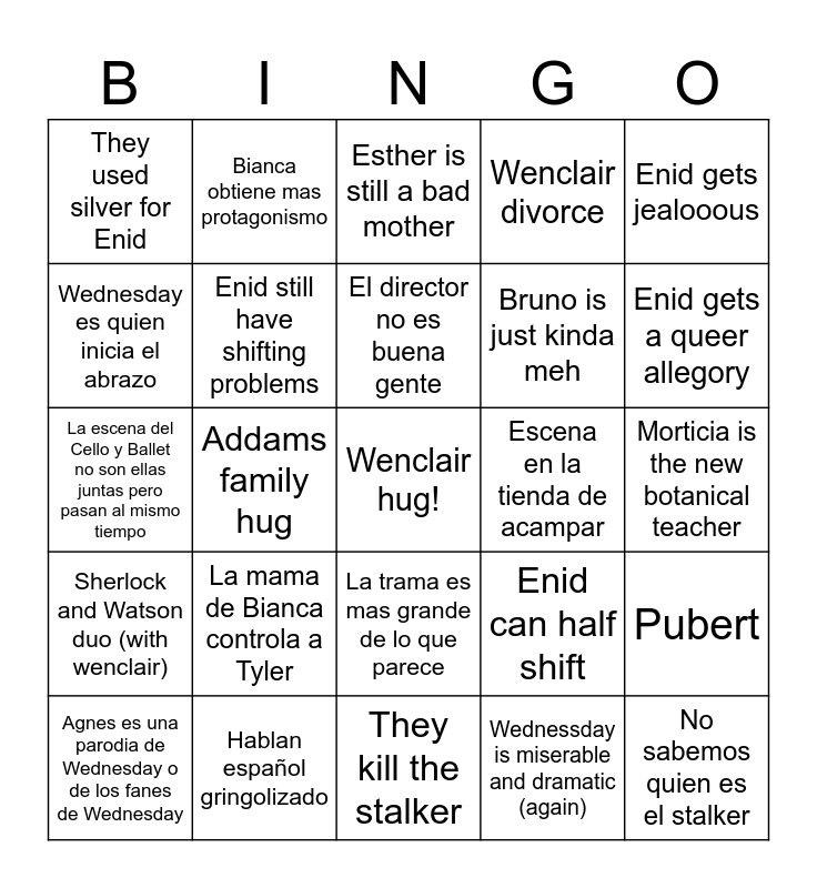 This bingo card has a free space and 24 words: La mama de Bianca controla a Tyler, Hablan español gringolizado, El director no es buena gente, Agnes es una parodia de Wednesday o de los fanes de Wednesday, Enid gets jealooous, They used silver for Enid, Wednesday es quien inicia el abrazo, Bianca obtiene mas protagonismo, Escena en la tienda de acampar, La trama es mas grande de lo que parece, Bruno is just kinda meh, La escena del Cello y Ballet no son ellas juntas pero pasan al mismo tiempo, Enid can half shift, Pubert, Enid still have shifting problems, Wednessday is miserable and dramatic (again), Morticia is the new botanical teacher, Esther is still a bad mother, Enid gets a queer allegory, Addams family hug, No sabemos quien es el stalker, Sherlock and Watson duo (with wenclair), Wenclair divorce and They kill the stalker.