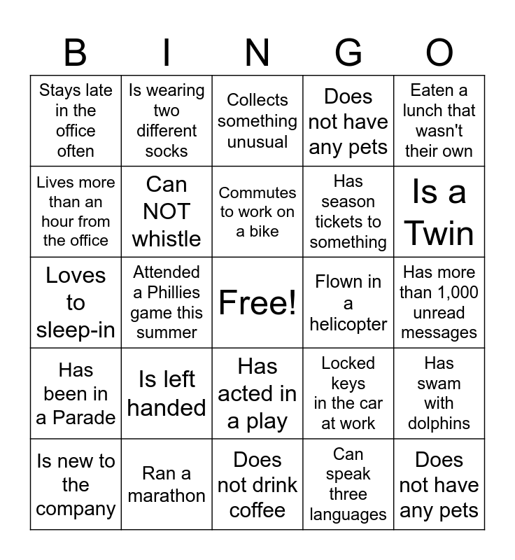 This bingo card has a free space and 29 words: Is new to the company, Rides a motorcycle, Attended a Phillies game this summer, Wears the same shoe size as you, Stays late in the office often, Collects something unusual, Can NOT whistle, Is left handed, Flown in a helicopter, Ran a marathon, Has more than 1,000 unread messages, Does not have any pets, Does not drink coffee, Can speak three languages, Is a Twin, Has slept in an airport, Has acted in a play, Has been in a Parade, Eaten a lunch that wasn't their own, Loves to sleep-in, Locked keys in the car at work, Born in the same month as you, Has season tickets to something, Lives more than an hour from the office, Does not have any pets, Is wearing two different socks, Has swam with dolphins, Commutes to work on a bike and Does not drink coffee.