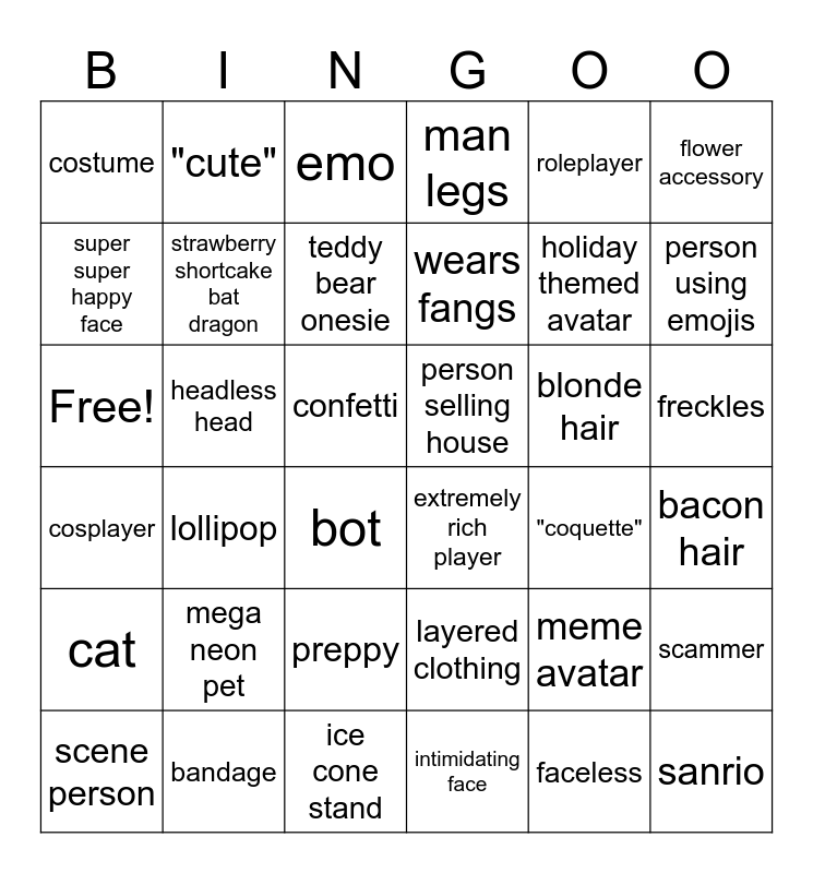 This bingo card has 36 words: layered clothing, preppy, intimidating face, super super happy face, cosplayer, person selling house, strawberry shortcake bat dragon, ice cone stand, roleplayer, meme avatar, person using emojis, man legs, scammer, headless head, wears fangs, costume, cat, blonde hair, Free!, emo, confetti, lollipop, extremely rich player, bot, "coquette", "cute", holiday themed avatar, bandage, teddy bear onesie, flower accessory, sanrio, scene person, bacon hair, freckles, mega neon pet and faceless.