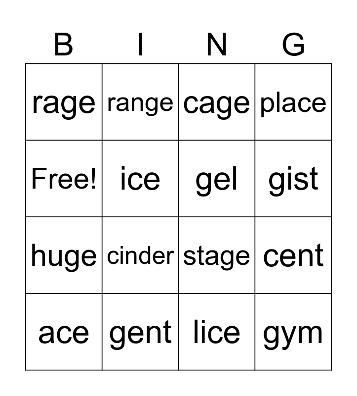 This bingo card has 16 words: gent, cent, cage, rage, huge, range, stage, lice, Free!, ice, ace, place, cinder, gist, gel and gym.