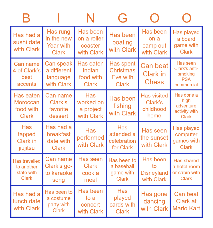 This bingo card has 36 words: Has been to a baseball game with Clark, Has seen Clark cook a meal, Has played cards with Clark, Can name 4 of Clark’s best accents, Has tapped Clark in jiujitsu, Has been fishing with Clark, Can speak a different language with Clark, Has been to a concert with Clark, Has been on a camp out with Clark, Has been to Disneyland with Clark, Has seen Clark’s anti-smoking PSA commercial, Has been boating with Clark, Has shared a hotel room or cabin with Clark, Can name Clark’s favorite dessert, Has spent Christmas Eve with Clark, Has had a sushi date with Clark, Has travelled to another state with Clark, Has visited Clark’s childhood home, Has eaten Moroccan food with Clark, Has been on a roller coaster with Clark, Has worked on a project with Clark, Has had a breakfast date with Clark, Has attended a celebration for Clark, Has performed with Clark, Has seen the sunset with Clark, Has rung in the new Year with Clark, Can beat Clark in Chess, Has been to a costume party with Clark, Has eaten Indian food with Clark, Has played a board game with Clark, Can beat Clark at Mario Kart, Has had a lunch date with Clark, Has played computer games with Clark, Has done a high adventure activity with Clark, Can name Clark’s go-to karaoke song and Has gone dancing with Clark.