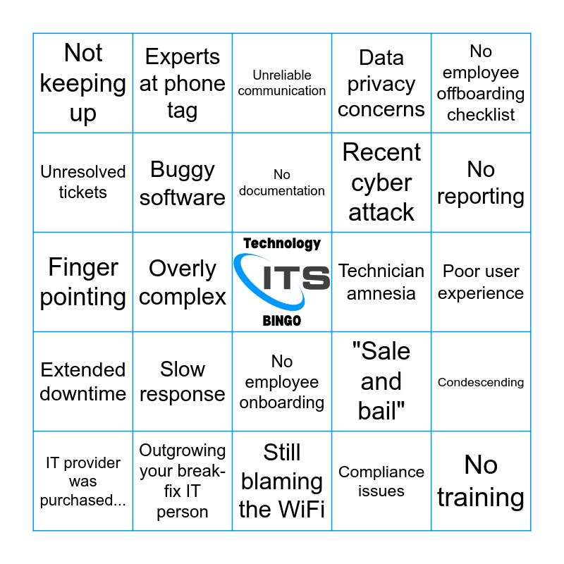 This bingo card has a free space and 24 words: Slow response, Outgrowing your break-fix IT person, No documentation, IT provider was purchased..., No employee offboarding checklist, Not keeping up, Unresolved tickets, Experts at phone tag, Technician amnesia, No employee onboarding, Recent cyber attack, Finger pointing, "Sale and bail", Condescending, Buggy software, Compliance issues, Poor user experience, Unreliable communication, No reporting, Overly complex, No training, Extended downtime, Data privacy concerns and Still blaming the WiFi.