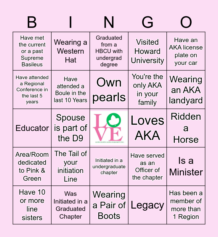 This bingo card has a free space and 39 words: The Ace of your initiation line, Been a bridesmaid in a Soror's wedding, Own any of the AKA luggage, Have attended a Boule in the last 10 Years, Have 10 or more line sisters, Initiated in a undergraduate chapter, Own pearls, More than three AKA's in your family, Have an AKA license plate on your car, Area/Room dedicated to Pink & Green, Spouse is part of the D9, Visited Howard University, Has been a member of more than 1 Region, Ridden a Horse, Loves AKA, The Tail of your initiation Line, Has a master's degree, Have met the current or a past Supreme Basileus, Have been to the corporate office in Chicago, Have served as an Officer of the chapter, Have attended a Regional Conference in the last 5 years, Wearing a Pair of Boots, You're the only AKA in your family, Wearing an AKA landyard, Wearing Green Only, Wearing Pink Only, Wearing a color other than Pink and/or Green, Wearing Sneakers, Wearing a Western Pin, Wearing a Western Hat, Wearing a Buckled Belt, Wearing a Western Vest, Graduated from a HBCU with undergrad degree, Was Initiated in a Graduated Chapter, Legacy, Has a doctoral degree, Is a Minister, Educator and Has own Business.
