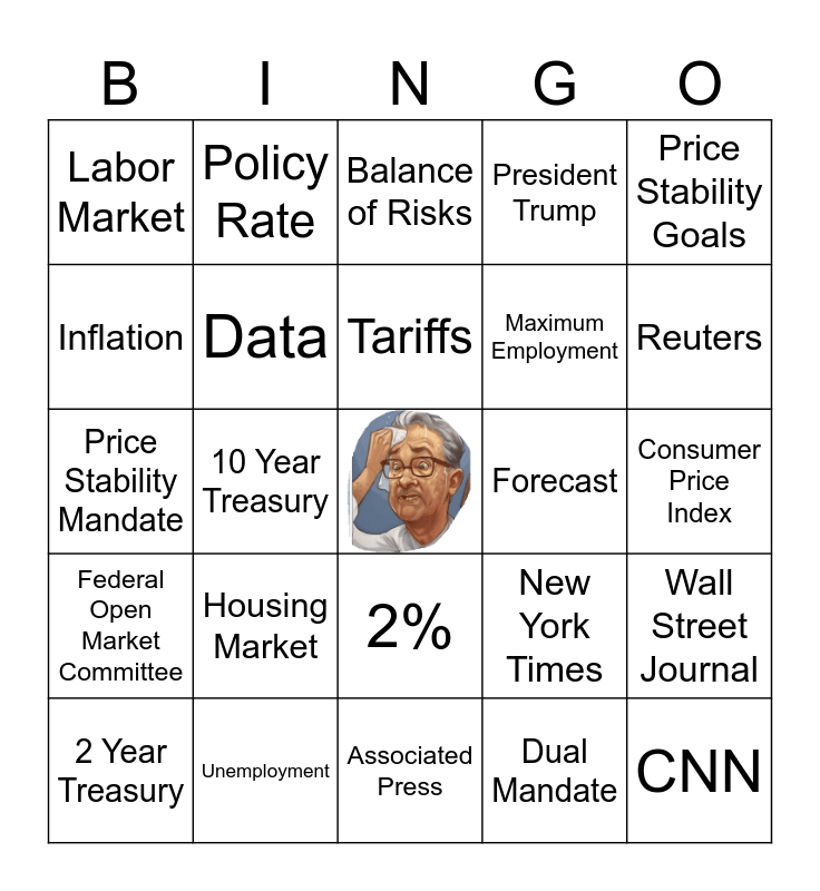 This bingo card has a free space and 26 words: 2%, Dual Mandate, Tariffs, Unemployment, Price Stability Goals, Labor Market, Inflation, Policy Rate, Consumer Price Index, New York Times, Maximum Employment, Price Stability Mandate, Wall Street Journal, 2 Year Treasury, 10 Year Treasury, Economy, President Trump, Federal Open Market Committee, Balance of Risks, CNN, Reuters, Associated Press, Forecast, Housing Market, Data and Uncertainty.