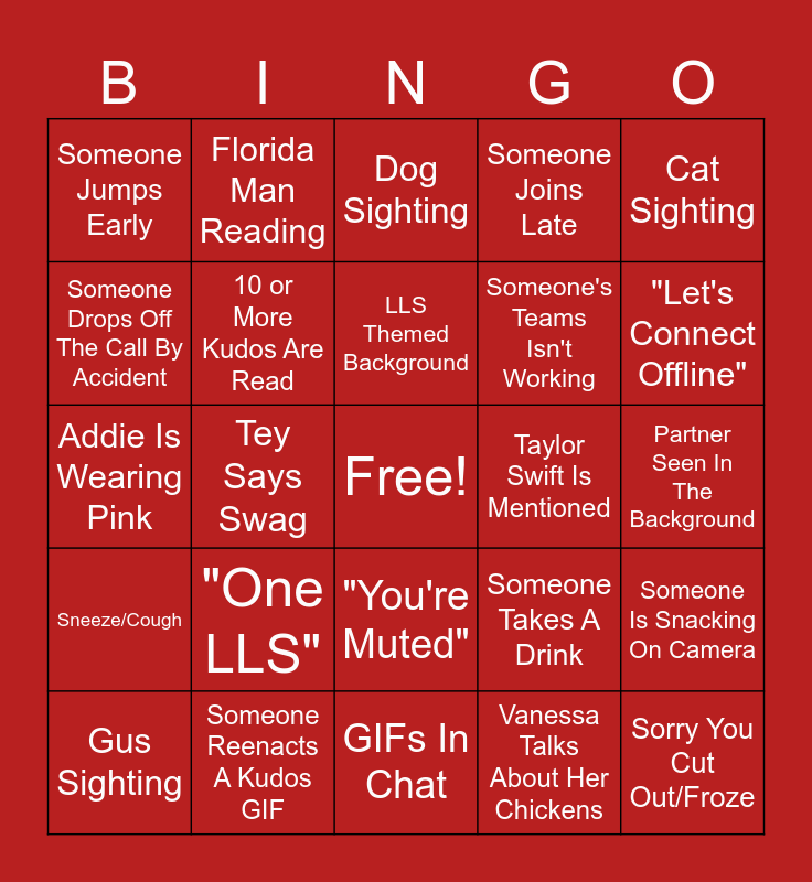 This bingo card has a free space and 24 words: "One LLS", Someone Reenacts A Kudos GIF, LLS Themed Background, Gus Sighting, Cat Sighting, Someone Jumps Early, Someone Drops Off The Call By Accident, Florida Man Reading, Taylor Swift Is Mentioned, "You're Muted", Someone's Teams Isn't Working, Addie Is Wearing Pink, Someone Takes A Drink, Someone Is Snacking On Camera, 10 or More Kudos Are Read, Vanessa Talks About Her Chickens, Partner Seen In The Background, Dog Sighting, "Let's Connect Offline", Tey Says Swag, Sorry You Cut Out/Froze, Sneeze/Cough, Someone Joins Late and GIFs In Chat.