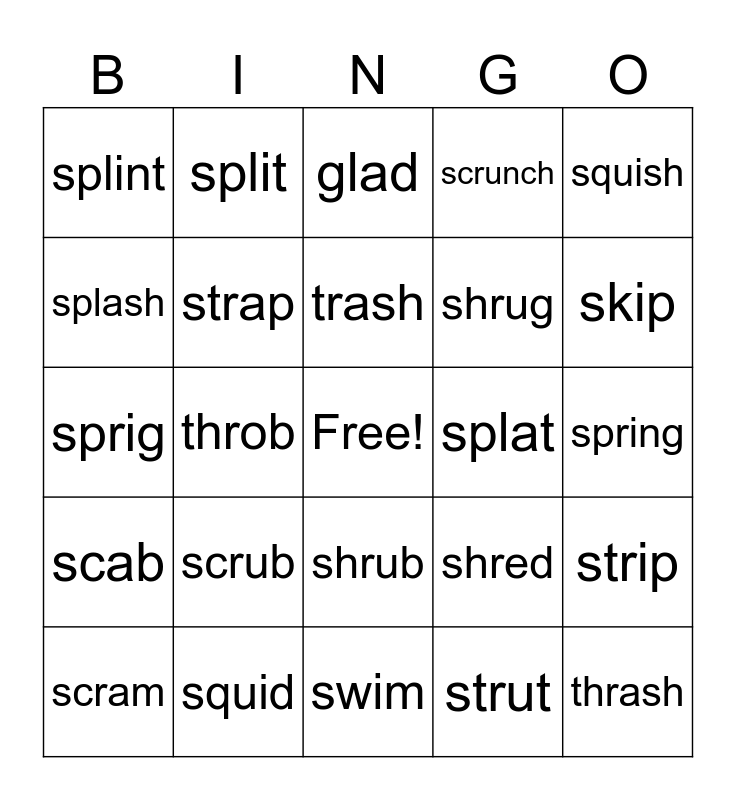 This bingo card has a free space and 24 words: scrub, squid, trash, scram, squish, splint, splash, split, splat, shrub, shrug, sprig, shred, strip, strap, strut, spring, glad, skip, throb, thrash, scab, scrunch and swim.