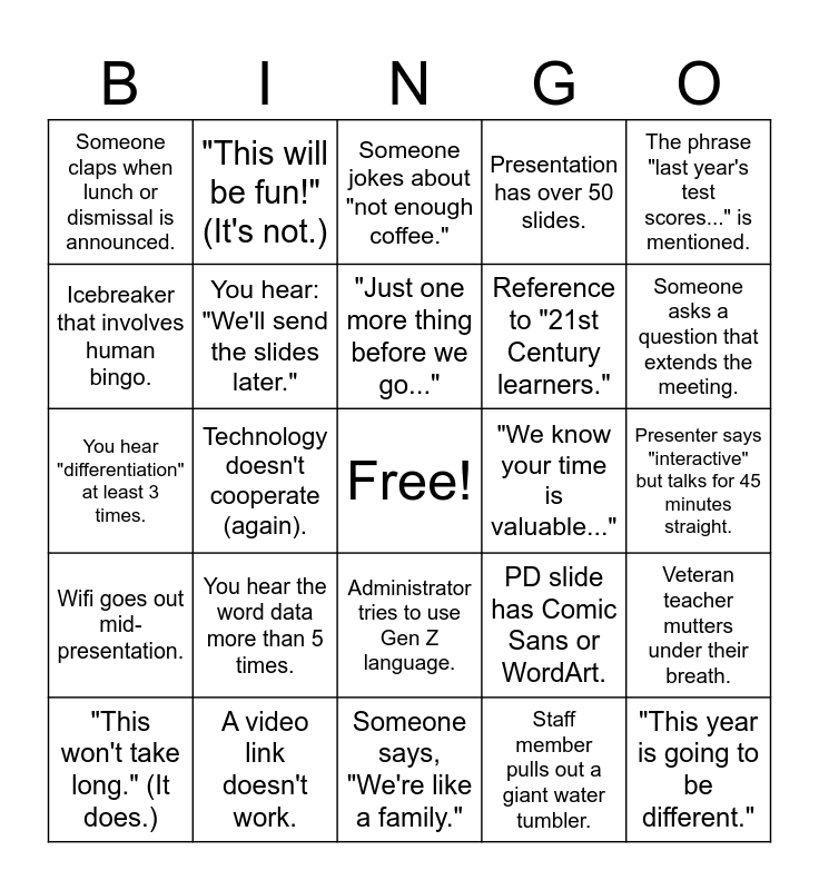 This bingo card has a free space and 24 words: You hear the word data more than 5 times., A video link doesn't work., "Just one more thing before we go...", "This won't take long." (It does.), The phrase "last year's test scores..." is mentioned., Someone claps when lunch or dismissal is announced., Icebreaker that involves human bingo., "This will be fun!" (It's not.), "We know your time is valuable...", Administrator tries to use Gen Z language., Reference to "21st Century learners.", You hear "differentiation" at least 3 times., PD slide has Comic Sans or WordArt., Veteran teacher mutters under their breath., You hear: "We'll send the slides later.", Staff member pulls out a giant water tumbler., Presenter says "interactive" but talks for 45 minutes straight., Someone jokes about "not enough coffee.", Someone asks a question that extends the meeting., Technology doesn't cooperate (again)., "This year is going to be different.", Wifi goes out mid-presentation., Presentation has over 50 slides. and Someone says, "We're like a family.".