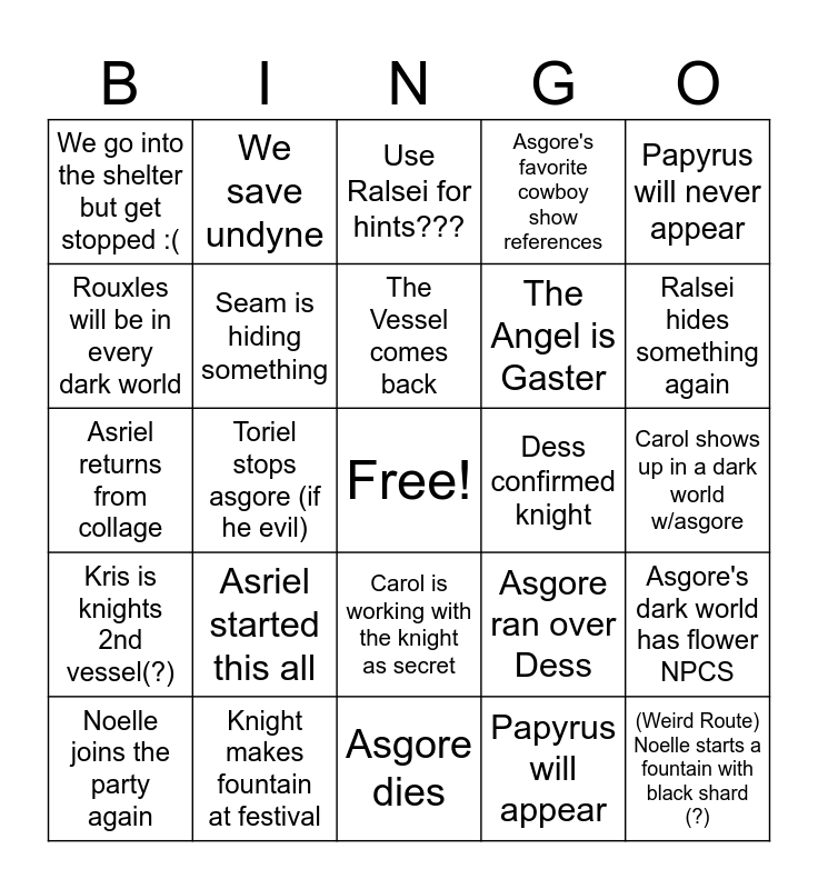This bingo card has a free space and 24 words: Asriel started this all, Knight makes fountain at festival, The Vessel comes back, Noelle joins the party again, Papyrus will never appear, We go into the shelter but get stopped :(, Rouxles will be in every dark world, We save undyne, Dess confirmed knight, Carol is working with the knight as secret, The Angel is Gaster, Asriel returns from collage, Asgore ran over Dess, Asgore's dark world has flower NPCS, Seam is hiding something, Papyrus will appear, Carol shows up in a dark world w/asgore, Use Ralsei for hints???, Ralsei hides something again, Toriel stops asgore (if he evil), (Weird Route) Noelle starts a fountain with black shard (?), Kris is knights 2nd vessel(?), Asgore's favorite cowboy show references and Asgore dies.