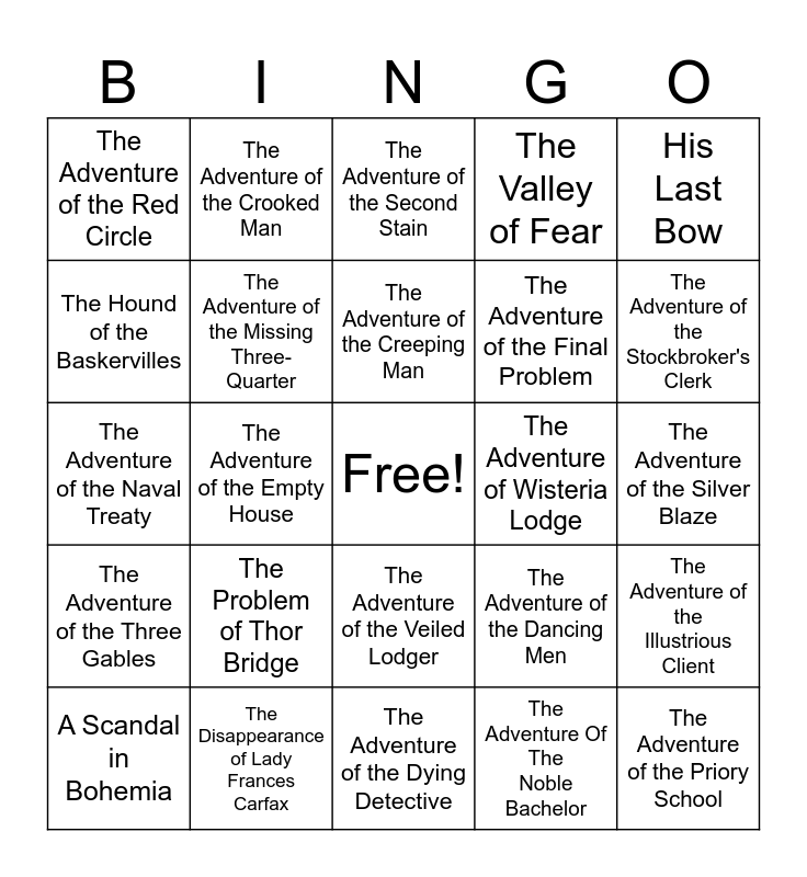This bingo card has a free space and 49 words: A Study In Scarlet, A Case Of Identity, The Adventure Of The Speckled Band, The Adventure Of The Noble Bachelor, The Adventure of the Silver Blaze, The Adventure of the Cardboard Box, The Adventure of the Crooked Man, The Adventure of the Greek Interpreter, The Adventure of the Final Problem, The Man With the Twisted Lip, The Hound of the Baskervilles, The Adventure of the Empty House, The Adventure of the Dancing Men, The Adventure of the Priory School, The Adventure of the Six Napoleons, The Adventure of the Three Students, The Adventure of the Second Stain, The Adventure of Wisteria Lodge, The Adventure of the Devil's Foot, The Adventure of the Red Circle, The Disappearance of Lady Frances Carfax, The Adventure of the Dying Detective, The Valley of Fear, His Last Bow, The Adventure of the Mazarin Stone, The Problem of Thor Bridge, The Adventure of the Creeping Man, The Adventure of the Sussex Vampire, The Adventure of the Illustrious Client, The Adventure of the Three Gables, The Adventure of the Lion's Mane, The Adventure of the Veiled Lodger, The Adventure of Shoscombe Old Place, The Sign Of Four, A Scandal in Bohemia, The Boscombe Valley Mystery, FREE, The Adventure of the Copper Beeches, The Adventure of the Stockbroker's Clerk, The Adventure of the Gloria Scott, The Adventure of the Musgrave Ritual, The Adventure of the Resident Patient, The Adventure of the Norwood Builder, THe Adventure of the Solitary Cyclist, The Adventure of the Naval Treaty, The Adventure of the Missing Three-Quarter, The Five Orange Pips, The Adventure of the Engineer's Thumb and The Adventure of the Beryl Coronet.
