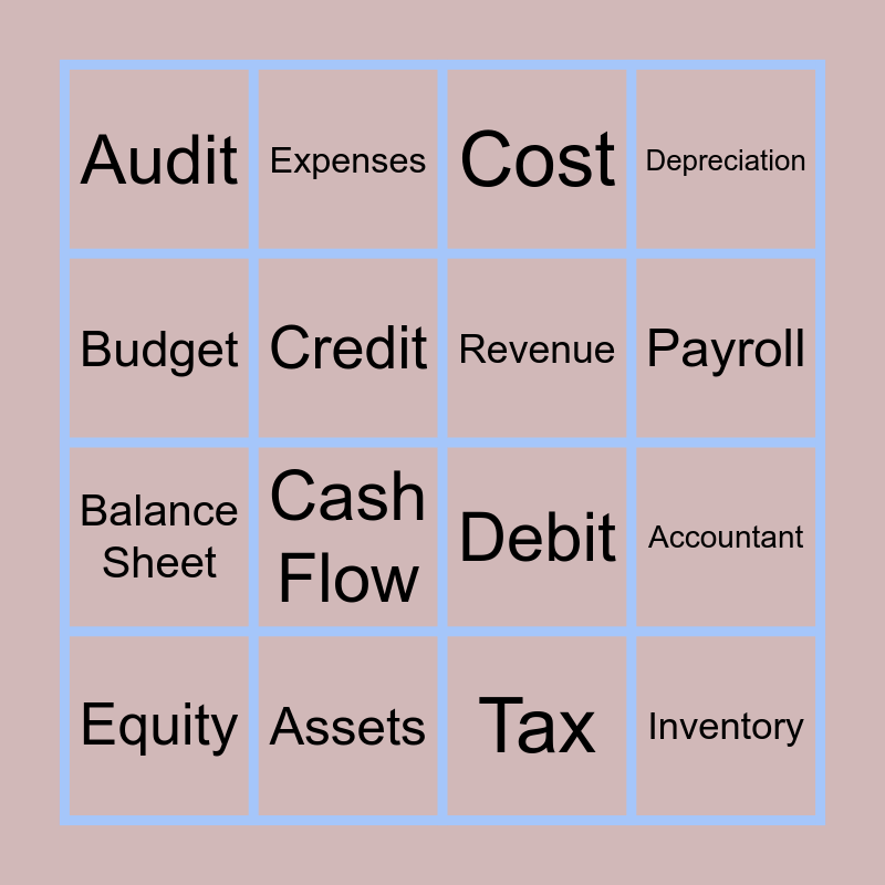 This bingo card has 16 words: Assets, Accountant, Cost, Audit, Balance Sheet, Expenses, Debit, Tax, Budget, Credit, Equity, Depreciation, Cash Flow, Payroll, Revenue and Inventory.