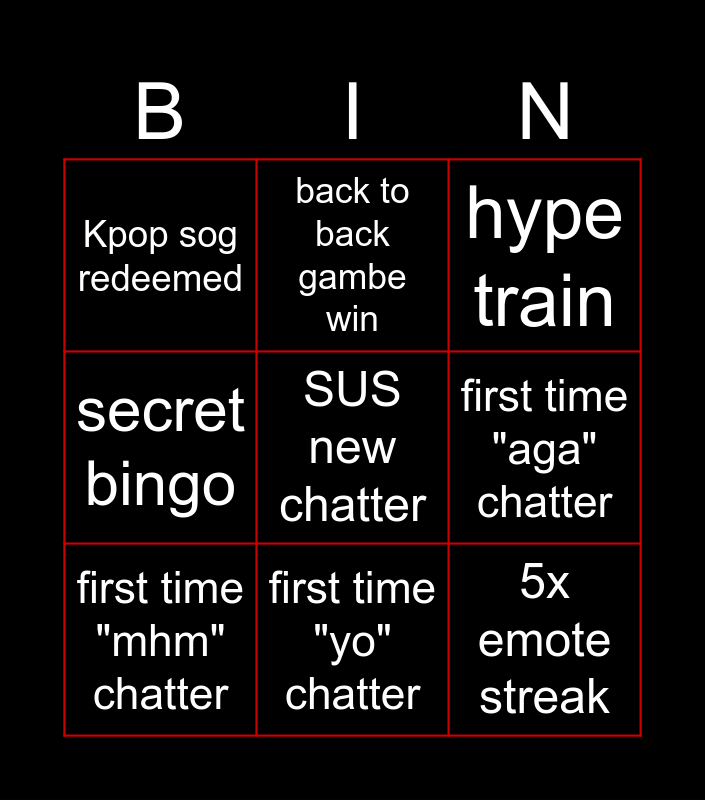 This bingo card has a free space and 8 words: first time "aga" chatter, hype train, back to back gambe win, first time "mhm" chatter, Kpop sog redeemed, 5x emote streak, secret bingo and first time "yo" chatter.
