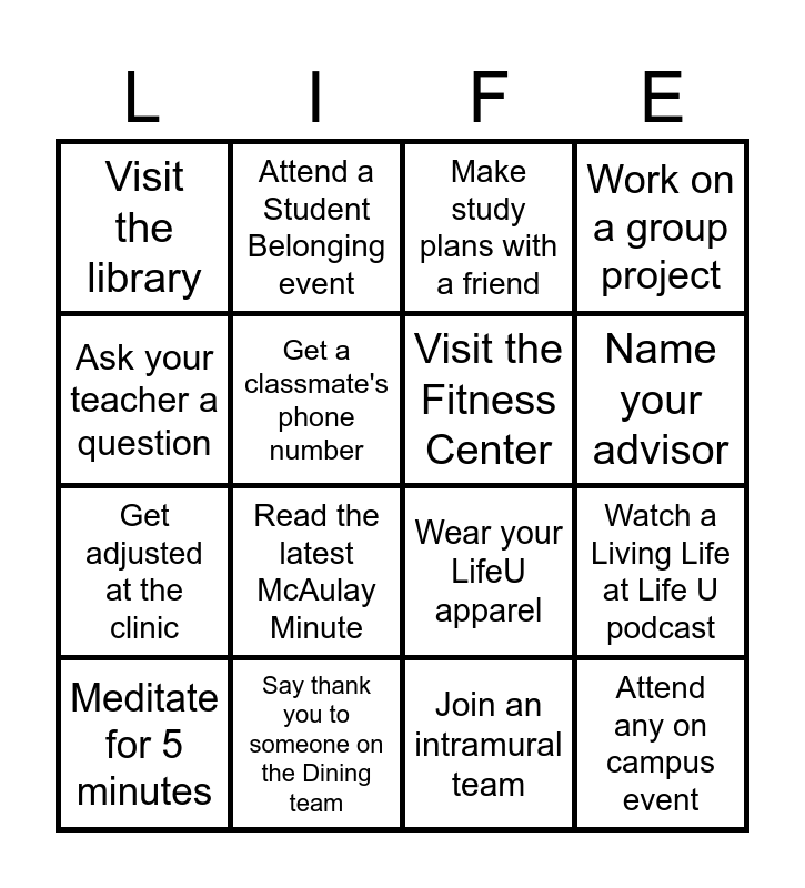 This bingo card has 24 words: Eat at Socrates Cafe, Attend a club meeting, Name your advisor, Say thank you to someone on the Grounds team, Ask your teacher a question, Visit the library, Get a classmate's phone number, Attend a Student Belonging event, Say thank you to someone on the Dining team, Follow a Life affiliated account on Instagram, Get adjusted at the clinic, Wear your LifeU apparel, Say hi to someone new on campus, Eat at the Commons Dining Hall, Visit the Fitness Center, Check Engage and RSVP to an event, Join an intramural team, Make study plans with a friend, Read the latest McAulay Minute, Watch a Living Life at Life U podcast, Meditate for 5 minutes, Attend any on campus event, Work on a group project and Visit one of Life's walking trails.