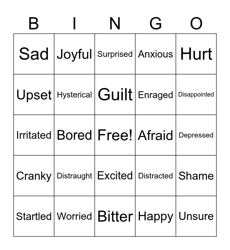This bingo card has a free space and 29 words: Startled, Relaxed, Bored, Content, Sad, Surprised, Hysterical, Distraught, Afraid, Worried, Depressed, Unsure, Bitter, Happy, Disappointed, Grief, Excited, Cranky, Hurt, Irritated, Distracted, Aggravated, Enraged, Upset, Anxious, Joyful, Shame, Guilt and Grateful.