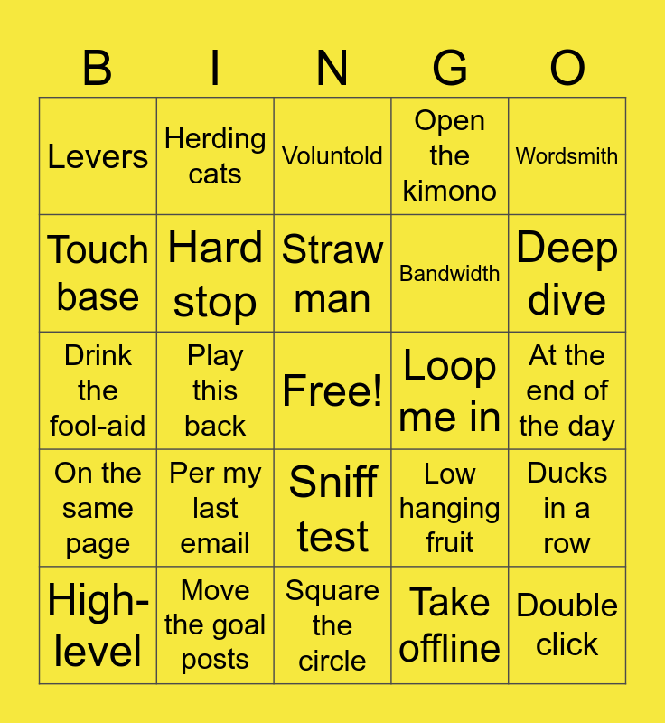 This bingo card has a free space and 39 words: Circle back, 10,000 foot view, Close the loop, Hard stop, High-level, Sniff test, Straw man, SWAG, Wordsmith, On the same page, Play this back, Open the kimono, Double click, At the end of the day, Loop me in, Per my last email, Outside the box, Levers, Boil the ocean, Low hanging fruit, Touch base, Square the circle, Bandwidth, Deep dive, Above my pay grade, Brain dump, Deliverable, Flesh/flush out, Go to Market, Herding cats, In the weeds, Reinvent the wheel, Voluntold, Move the goal posts, Take offline, Above my paygrade, Ducks in a row, Drink the fool-aid and Action item.