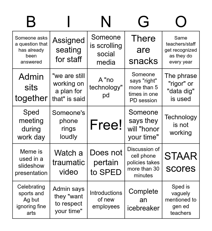 This bingo card has a free space and 24 words: Watch a traumatic video, Admin says they "want to respect your time", A "no technology" pd, Celebrating sports and Ag but ignoring fine arts, Same teachers/staff get recognized as they do every year, Someone asks a question that has already been answered, Admin sits together, Assigned seating for staff, Someone says they will "honor your time", Does not pertain to SPED, Someone says "right" more than 5 times in one PD session, Sped meeting during work day, Discussion of cell phone policies takes more than 30 minutes, STAAR scores, "we are still working on a plan for that" is said, Complete an icebreaker, Technology is not working, Someone is scrolling social media, The phrase "rigor" or "data dig" is used, Someone's phone rings loudly, Sped is vaguely mentioned to gen ed teachers, Meme is used in a slideshow presentation, There are snacks and Introductions of new employees.