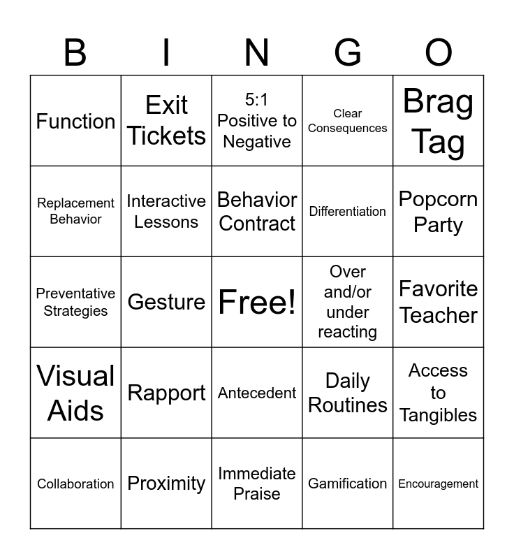This bingo card has a free space and 24 words: Rapport, Proximity, Behavior Contract, Collaboration, Brag Tag, Function, Replacement Behavior, Exit Tickets, Over and/or under reacting, Antecedent, Differentiation, Preventative Strategies, Daily Routines, Access to Tangibles, Interactive Lessons, Gamification, Favorite Teacher, 5:1 Positive to Negative, Popcorn Party, Gesture, Encouragement, Visual Aids, Clear Consequences and Immediate Praise.